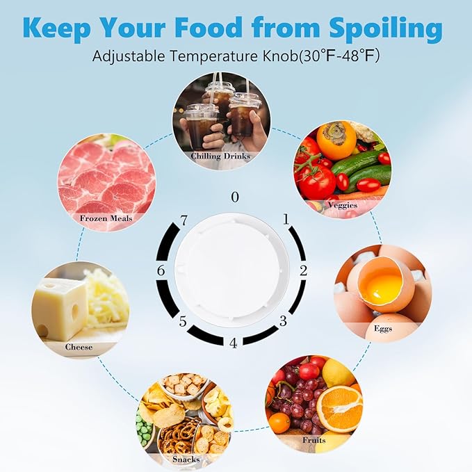 - ๐ฅ๐๐๐ฃ๐ฎ๐ฌ๐ญ๐๐๐ฅ๐ ๐๐๐ฆ๐ฉ๐๐ซ๐๐ญ๐ฎ๐ซ๐๐ฌ: This Mini Fridge has a rotary thermostat button inside. The freezer has a temperature range of 32ยฐF to 50ยฐF (not suitable for storing ice cream) and the fridge offers 7 variable temperature settings depending on your needs. Cold storage and larger freezer compartment for storing beverages, fruits, face masks or a small amount of frozen food.