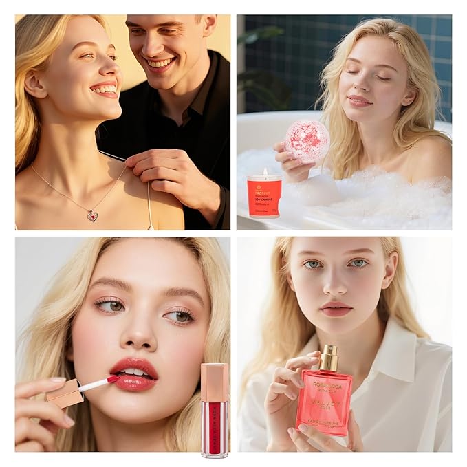 Christmas Gifts for Women, Red Rose 33 Pcs Spa Bath & Body Gift Set, Face Sheet Mask Skin Care, Hydrogel Mask, Lip Gloss, Cosmetic Bag, Face Serum, Necklace, Cleanser, Gua Sha, Mother Day, Birthday
