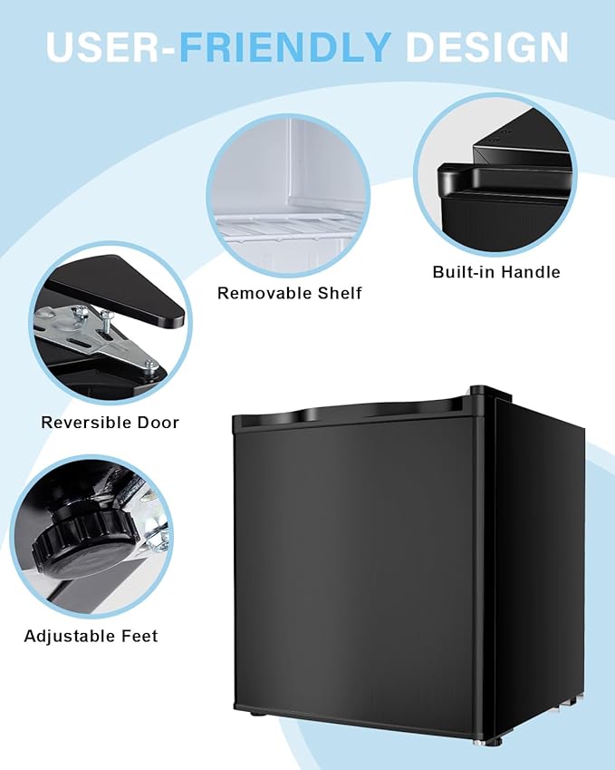 - User-Friendly Design: This small freezer upright features a reversible door that allows left or right opening, fitting perfectly against walls or in corners to suit different room layouts. Adjustable leveling legs keep it stable on uneven floors. The top ergonomic handle allows easy access without bending—combining flexible placement with everyday convenience.